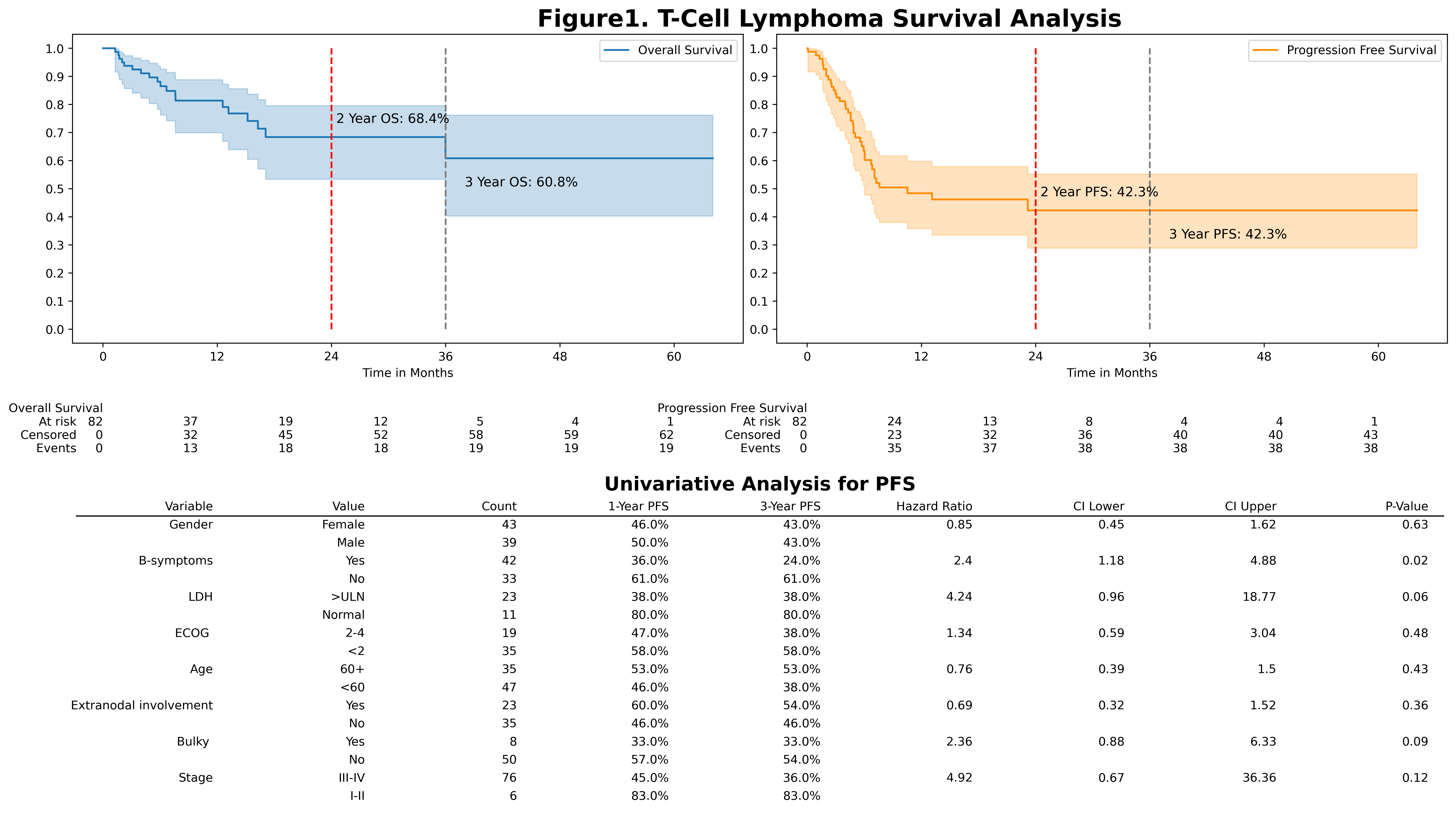 A total of 100 patients with PTCLs and NKTCL were registered by 15 centers. Median age at diagnosis was 54 years (range 18–83), with a male:female ratio of 49:51. The most common histologic subtypes were PTCL-NOS (35), AITL (25), ALK-negative ALCL (11), ATLL (9), and ALK-positive ALCL (7). Most frequent first-line regimens were CHOEP, CHOP/CHOP-like, and BV-CHP (41.0%, 29.5%, and 10.3%), with transplantation in 5 cases (6%). First-line therapy data were available in 78 patients. Mean follow-up was 16 months (0.3–64). Twenty-nine patients were refractory or relapsed; mean time to event was 5.5 months (0.07–23). One- and two-year OS were 81% and 68.4%, while PFS rates were 48% and 42.3%, respectively. In univariate analysis, only the presence of B-symptoms showed significant association with relapse (p=0.02).(Figure1)