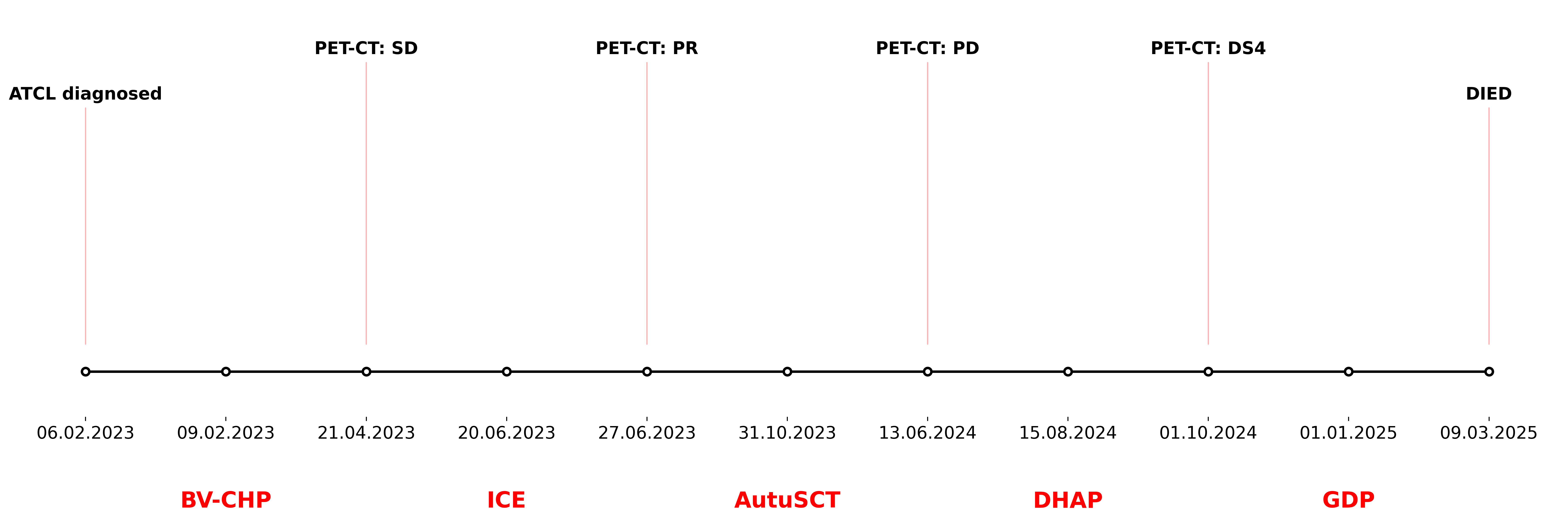 At day +100 post-ASCT, PET-CT showed disease progression with multiple new FDG-avid lesions. Subsequent therapy with two cycles of DHAP was administered, but PET-CT demonstrated persistent metabolically active disease. Due to treatment-related toxicities and absence of clinical benefit, therapy was transitioned to a GDP. After two cycles, the patient developed liver failure and died at the beginning of cycle three, timeline - Figure 1.